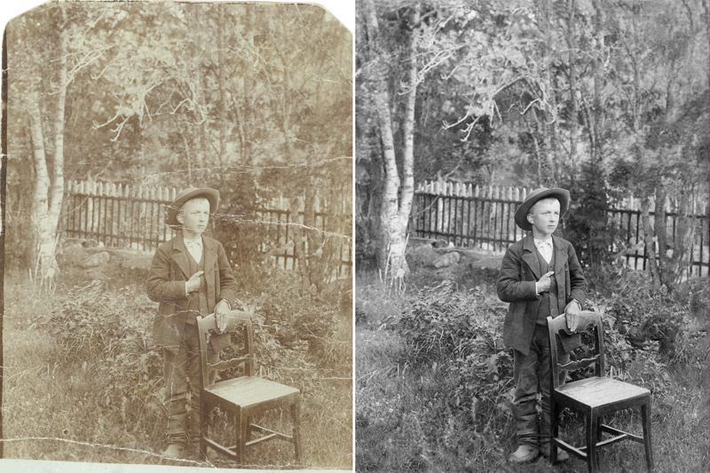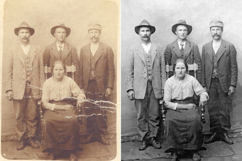 Retusoinnilla voimme poistaa kuvasta tahroja, paikata naarmuja, repeytymiä, tasapainottaa kontrastin ja palauttaa värejä.